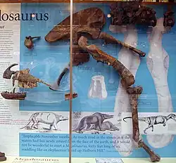 | Espécimes fósseis referidos a M. bucklandii, Museu de História Natural da Universidade de Oxford. O display mostra a maior parte da série original do sintipo, incluindo o lectótipo dentário, identificado por William Buckland em 1824 | |