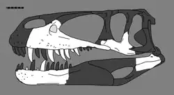 A mandíbula inferior é bastante robusta. Também é reto em vista superior, sem muita expansão na ponta da mandíbula, sugerindo que as mandíbulas inferiores como um par, a mandíbula, eram estreitas. Várias características foram identificadas como autapomorfias, mais tarde revelaram-se resultado de danos. No entanto, uma combinação única de características está presente no amplo sulco longitudinal na face externa (compartilhado com o Torvosaurus), no pequeno terceiro dente dentário e em um canal vascular, abaixo da fileira de placas interdentais, que só é fechado a partir da posição do quinto dente em diante. O número de dentes era provavelmente 13 ou 14, embora os espécimes danificados preservados mostrem no máximo 11 alvéolos dentários. As placas interdentais têm faces internas lisas, enquanto as da maxila são estriadas verticalmente; a mesma combinação é mostrada pelo Piatnitzkysaurus. O surangular não possui plataforma óssea, nem mesmo crista, em sua face externa. Lateralmente há uma abertura oval presente na frente da articulação da mandíbula, um forame surangular posterior, mas falta um segundo forame surangular anterior à frente dele.[22]