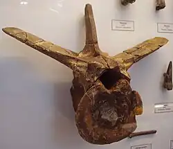 O material Stonesfield Slate não contém vértebras cervicais; mas uma única vértebra cervical anterior quebrada é conhecida na pedreira de New Park, espécime BMNH R9674. A quebra revela grandes câmaras de ar internas. A vértebra também é fortemente pneumática, com grandes depressões pneumáticas, nas laterais. A face posterior do centro é fortemente côncava. As costelas do pescoço são curtas. As vértebras dorsais anteriores tem facetas centrais frontais convexas e facetas centrais traseiras côncavas. Eles também têm uma quilha profunda, com a crista na parte inferior representando cerca de 50% da altura total do centro. As dorsais anteriores talvez tenham uma depressão pneumática acima da diapófise, o processo articular da costela inferior. As vértebras dorsais posteriores, segundo Benson, não são pneumáticas. A altura dos espinhos dorsais das vértebras posteriores é desconhecida, mas um espinho alto em uma vértebra caudal do material da pedreira New Park, espécime BMNH R9677, sugere a presença de uma crista na região do quadril. As espinhas das cinco vértebras do sacro formam uma placa supraneural, fundida na parte superior. A parte inferior das vértebras sacrais é arredondada, mas a segunda vértebra sacral é quilhada; normalmente é o terceiro ou quarto sacro com uma crista. As vértebras sacrais parecem não ser pneumatizadas, mas apresentam escavações nas laterais. As vértebras da cauda são ligeiramente anficoelosas, com facetas centrais ocas na parte anterior e posterior. Possuem escavações nas laterais e um sulco longitudinal na parte inferior. As espinhas neurais da base da cauda são transversalmente finas e altas, representando mais da metade da altura vertebral total.[22]