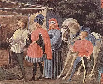 Têmpera sobre tela de Paolo Uccello. A pintura do século XV demonstra o uso muito difundido das meias-calças naquela época.