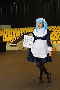Meias-calças azuis são usadas no cosplay da Wikipe-tan, uma mascote antropomórfica moe da Wikipédia.
