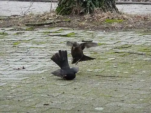 O melro-preto não é gregário, exibindo um comportamento territorial nos locais de nidificação. Os machos estabelecem o seu território durante o primeiro ano de vida, e defendem-no por toda a vida.[52] Durante a época de nidificação o macho defende o seu território afugentando outros machos ou utilizando uma exibição de ameaça, que consiste numa pequena corrida, primeiro levantando a cabeça e depois baixando-a em simultâneo com a cauda.[7] Se efetivamente ocorrer uma briga entre dois machos, eles se enfrentam pairando a poucos centímetros do solo, gritando e esticando as pernas em direção ao oponente.[11] Estas lutas são geralmente curtas, mais demonstrativas do que violentas, e o intruso é rapidamente afugentado.[7] A fêmea também é agressiva na primavera, quando compete com outras fêmeas por um bom território de nidificação ou parceiro, e embora brigas entre fêmeas sejam menos frequentes, tendem a ser mais violentas.[7] Fora da época de nidificação, pequenos grupos de melros-pretos podem compartilhar fontes abundantes de alimento e locais de empoleiramento para passar a noite, mas mesmo nestes casos há pouca interação entre os indivíduos.[52]