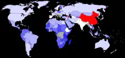 Razão entre meninos e meninas, com idade abaixo de 15 anos (dados mundiais de 2006). Azul: abaixo de 0,99; Branco: 1,0-1,13; Vermelho: acima de 1,13