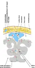 ![]() Representação diagramática da seção do topo do crânio, mostrando as meninges, etc. | |