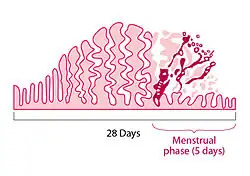 • Fase menstrual: início da fase folicular do ciclo ovárico. Ocorre a descamação da maior parte do Endométrio, que como é um tecido muito vascularizado, vai apresentar algumas hemorragias por rompimento destes vasos sanguíneos. Sendo os fragmentos do Endométrio e algum sangue eliminados através da vagina para o exterior, originando o fluxo menstrual (chamado muitas vezes erroneamente de "sangue");