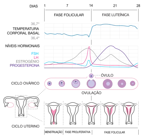 O ciclo menstrual é uma série coordenada de mudanças hormonais e fisiológicas nos ovários e no útero que tornam a gravidez possível. O ciclo ovariano regula a produção de óvulos e a liberação de hormônios, enquanto o ciclo uterino prepara o revestimento do útero para receber um embrião. Com duração média de 21 a 35 dias (geralmente 28), o ciclo começa com a menarca por volta dos 12 anos e continua por 30 a 45 anos. O aumento do estrogênio engrossa o endométrio e, caso não ocorra fecundação, a queda da progesterona desencadeia a menstruação, a eliminação desse revestimento, indicando que a gravidez não aconteceu.[16]