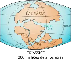 Representação da geografia física da Terra há 200 milhões de anos, no Triássico, o primeiro período desta era.