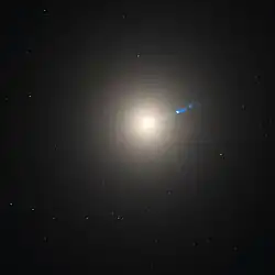 ![]() O núcleo galático de Messier 87 pelo Telescópio Espacial Hubble, com o jato azul de plasma visível | |