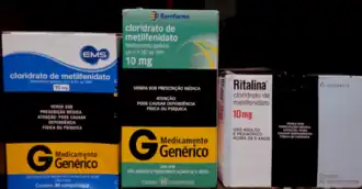 Caixas de metilfenidato em forma de comprimidos de liberação imediata de 10 mg, vendidas no Brasil (dos laboratórios EMS e Eurofarma, em formulações genéricas, e da Novartis, o medicamento de referêcia).[137]
