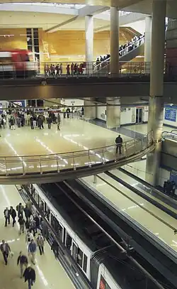 As estações funcionam como hubs para permitir que os passageiros embarquem e desembarquem de trens. Elas também são postos de controle de pagamento e permitem que os passageiros transfiram entre modos de transporte, por exemplo, para ônibus ou outros trens. O acesso é fornecido por plataformas nas ilhas ou nas laterais.[37] As estações de metrô, especialmente as de nível mais profundo, aumentam o tempo total de transporte: longas viagens de escada rolante até as plataformas significam que as estações podem se tornar gargalos se não forem construídas adequadamente. Algumas estações subterrâneas e elevadas são integradas em vastas redes subterrâneas ou elevadas, que podem se conectar a prédios comerciais próximos.[38] Nos subúrbios, pode haver um "estacionamento de incentivo" conectado à estação.[39]