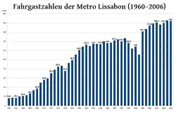 - ↑ Miguel, Inês Pinto (27 de janeiro de 2020). «Metro de Lisboa tem novo ano recorde. Empresa transportou 173 milhões de passageiros em 2019». O Jornal Económico. Consultado em 21 de outubro de 2022. Cópia arquivada em 21 de outubro de 2022