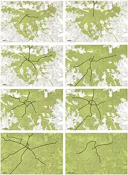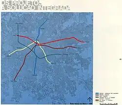 No início dos anos 1960, Prestes Maia voltou à prefeitura e Ademar de Barros, ao governo do estado, e criaram, em 13 de fevereiro de 1963, as comissões estadual e municipal para os estudos de criação do Metrô. Ademar destinou então quatro milhões de cruzeiros para o Metrô.[36] Com a instauração do regime militar, em 1964, o projeto do metrô de São Paulo teve de esperar o ano seguinte para ser retomado. O Brigadeiro Faria Lima assumiu a prefeitura da cidade em 1965 e tornou o projeto do metrô a meta de sua gestão. Em 31 de agosto de 1966, foi formado o Grupo Executivo do Metropolitano (GEM), que tinha como objetivo organizar nova concorrência internacional para um estudo de viabilidade econômico-financeira. Ao mesmo tempo, a câmara municipal aprovou a lei número 6 988, em 26 de dezembro de 1966, autorizando a criação da Companhia do Metropolitano de São Paulo. No ano seguinte, a concorrência internacional foi vencida pelo consórcio HMD (formado pelas empresas alemãs Hochtief e DeConsult e pela brasileira Montreal, que tinha entre seus acionistas o brigadeiro Eduardo Gomes[37]), que iniciou estudos geológicos e sociais, projetando uma rede básica de setenta quilômetros, dividida em quatro linhas: Norte–Sul (Santana ↔ Jabaquara), Nordeste–Noroeste (Casa Verde ↔ Vila Maria), Sudeste–Sudoeste (Jóquei Club ↔ Via Anchieta) e Paulista (Vila Madalena ↔ Paraíso); e mais dois ramais: Moema (Paraíso ↔ Moema) e Mooca (Pedro II ↔ Vila Bertioga). Essa rede tinha a previsão de estar pronta em 1978. No ano de 1968, enquanto o projeto do metrô avançava, o sistema de bondes de São Paulo, após anos de decadência, foi desativado no dia 27 de março. Em 24 de abril, foi criada pela prefeitura a Companhia do Metropolitano de São Paulo, que iniciaria as obras da linha Norte–Sul (Jabaquara ↔ Santana) em 14 de dezembro do mesmo ano.[34] Porém, por seu alto custo, logo a Companhia do Metrô foi assumida pelo governo estadual em 1979, embora a prefeitura de São Paulo ainda possua ações.[38]