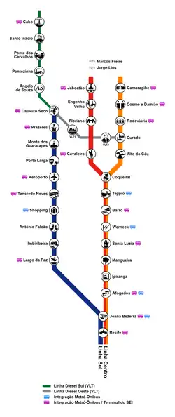 - ↑ A Estação Cajueiro Seco, da linha Sul do metrô, passou a fazer parte também da Linha Diesel, entre as estações Ângelo de Souza e Marcos Freire.