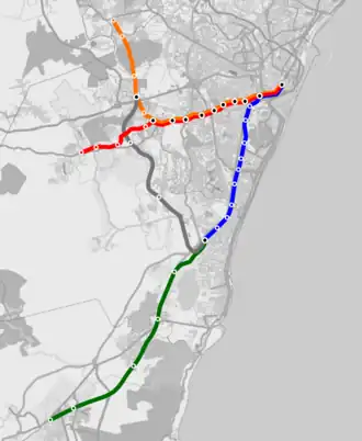 | Linha | Trajeto | Comprimento (km) | Estações | Duração das viagens (min) | Funcionamento |