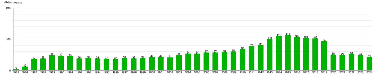 | Ano | Passageiros | Ano | Passageiros | Ano | Passageiros | Ano | Passageiros | Ano | Passageiros |
