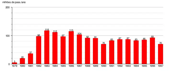 - ↑ Companhia do Metropolitano do Rio de Janeiro (1985). «7.1.Transporte Metroviário/7.1.4.Indiciadores operacionais do Metrô do Rio de Janeiro (1980-1984)». Anuário Estatístico dos Transportes do Brasil, página 634/Memória Estatística do Brasil-Biblioteca do Ministério da Fazenda no Rio de Janeiro/republicado no Internet Archive. Consultado em 23 de julho de 2020