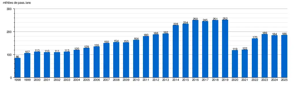 | Tráfego anual | 188,98 milhões (2023)[1][2] cerca de 660 mil, na média dos dias úteis (2023)[1][2] | ||||||||||||||||||||||||||||||||||||||||||||||||||||||||||||||||||||||||||||||||||||||||||||||||||||||||||||||||||||||||||||||||||||||||||||||||||||||||||||||||||||||||||||||||||||||||||||||||||||||||||||||||||||||||||||||||||||||||||||||||||||||||||||||||||||||||||||||||||||||||||||||||||||||||||||||||||||||||||||||||||||||||||||||||||||||||||||||||||||||||||