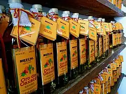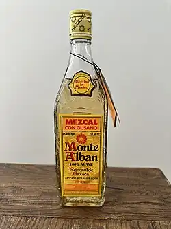 Mezcal (termo espanhol aportuguesado para mescal no Dicionário Houaiss da Língua Portuguesa; proveniente do náuatle mexcalli, uma possível derivação de metl = "ágave" + ixcalli = "cozimento" ou "decocção")[2][3] é uma bebida alcoólica destilada, produzida a partir do sumo fermentado de plantas do gênero Agave (regionalmente conhecidas sob o nome maguey pela população). O mezcal diferencia-se da tequila por ser uma bebida mais "rústica", com técnicas artesanais que remontam a séculos e são mantidas por pequenos empresários familiares, chamados palenqueros e palenques suas destilarias, produzindo lotes limitados da bebida, de geração em geração, sendo em geral destilada apenas uma ou duas vezes, contra duas ou três da tequila, que só pode ser extraída do sumo da ágave azul: Agave tequilana. Segundo sua Declaração de Proteção de Origem, vigente desde 1994, o mezcal é produzido nos estados mexicanos de Durango, Guerrero, San Luis Potosí e Zacatecas e sobretudo Oaxacaː o mezcal oaxaqueño, que supre mais de 70% de sua produção engarrafada;[1][4][5][6][7] sua Norma Oficial Mexicana-070-SCFI-1994 afirmando que as espécies de ágave oficialmente admitidas na sua fabricação são: Agave angustifolia, Agave esperrima, Agave weberi, Agave potatorum e Agave salmiana,[8] a produção se iniciando no século XVI entre as cidades de Armería-Ayuquila/Coahuayana-Tuxpan com o emprego de A. angustifolia.[9]
