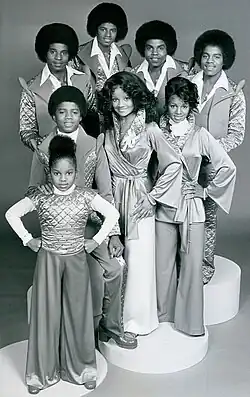 Da esquerda, na fila de trás: Jackie Jackson, Michael Jackson, Tito Jackson, Marlon Jackson. Linha do meio: Randy Jackson, La Toya Jackson, Rebbie Jackson. Primeira fila: Janet Jackson (1977).