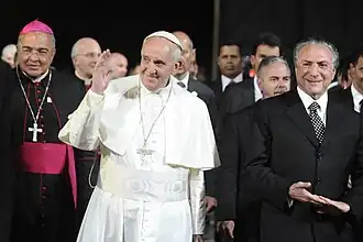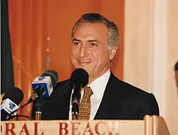 Michel Miguel Elias Temer Lulia GCC • GCMM • GOIH (Tietê, 23 de setembro de 1940) é um advogado, professor, escritor e político libano-brasileiro, filiado ao Movimento Democrático Brasileiro (MDB). Foi o 37.º presidente do Brasil de 31 de agosto de 2016 a 1.º de janeiro de 2019, empossado após o impeachment de Dilma Rousseff. Anteriormente, foi o 24.º vice-presidente do Brasil, entre 1° de janeiro de 2011 e 31 de agosto de 2016, sendo o terceiro vice-presidente membro do MDB que chegou à presidência da República pela linha sucessória, após José Sarney e Itamar Franco.[3] Exerceu também os cargos de deputado federal, presidente da Câmara dos Deputados, secretário da Segurança Pública de São Paulo e procurador-geral do mesmo estado.