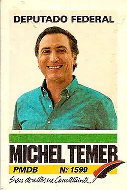 - ↑ «Michel Temer». Divulgação de Candidaturas e Contas. Tribunal Superior Eleitoral. 2014. Consultado em 30 de junho de 2024