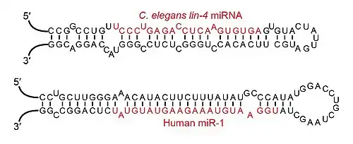 - ↑ Lee RC; Feinbaum RL; Ambros V (1993). «The C. elegans heterochronic gene lin-4 encodes small RNAs with antisense complementarity to lin-14.». Cell. 75: 843–854. PMID 8252621. doi:10.1016/0092-8674(93)90529-Y