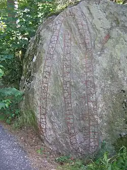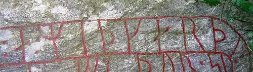 A inscrição em carateres rúnicos a:miþkarþi, em nórdico antigo à Miðgarði, significando "em Midgard", na pedra rúnica Fyrbystenen na Södermanland, Suécia