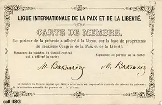 Cartão de membro de Bakunin na Liga de Paz e Liberdade