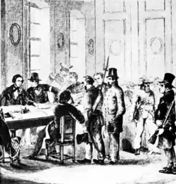 Bakunin (sentado à frente da mesa) se reúne com membros do governo provisório na prefeitura da cidade de Dresden, em 1849