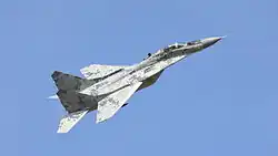 MiG-29UPG: o UPG foi uma nova modificação destinada aos MiG-29 usados pela Força Aérea Indiana. A versão indiana do UPG é semelhante à variante SMT, mas difere por ter um conjunto de aviônicos estrangeiros integrado a ela.[61] O conjunto de armas é o mesmo das versões SMT e K/KUB.[62] Ele fez seu voo inaugural em 4 de fevereiro de 2011. A versão inclui o novo radar Zhuk-M, novos aviônicos, uma sonda IFR, bem como novos motores turbofan RD-33 Série 3 aprimorados e o Sistema de Guerra Eletrônica DRDO/DARE D-29.[63]