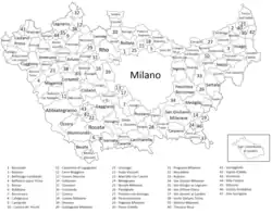 Abbiategrasso, Albairate, Arconate, Arese, Arluno, Assago, Baranzate, Bareggio, Basiano, Basiglio, Bellinzago Lombardo, Bernate Ticino, Besate, Binasco, Boffalora sopra Ticino, Bollate, Bresso, Bubbiano, Buccinasco, Buscate, Bussero, Busto Garolfo, Calvignasco, Cambiago, Canegrate, Carpiano, Carugate, Casarile, Casorezzo, Cassano d'Adda, Cassina de' Pecchi, Cassinetta di Lugagnano, Castano Primo, Cernusco sul Naviglio, Cerro al Lambro, Cerro Maggiore, Cesano Boscone, Cesate, Cinisello Balsamo, Cisliano, Cologno Monzese, Colturano, Corbetta, Cormano, Cornaredo, Corsico, Cuggiono, Cusago, Cusano Milanino, Dairago, Dresano, Gaggiano, Garbagnate Milanese, Gessate, Gorgonzola, Grezzago, Gudo Visconti, Inveruno, Inzago, Lacchiarella, Lainate, Legnano, Liscate, Locate di Triulzi, Magenta, Magnago, Marcallo con Casone, Masate, Mediglia, Melegnano, Melzo, Mesero, Milano, Morimondo, Motta Visconti, Nerviano, Nosate, Novate Milanese, Noviglio, Opera Ossona, Ozzero, Paderno Dugnano, Pantigliate, Parabiago, Paullo, Pero, Peschiera Borromeo, Pessano con Bornago, Pieve Emanuele, Pioltello, Pogliano Milanese, Pozzo d'Adda, Pozzuolo Martesana, Pregnana Milanese, Rescaldina, Rho, Robecchetto con Induno, Robecco sul Naviglio, Rodano, Rosate, Rozzano, San Colombano al Lambro, San Donato Milanese, San Giorgio su Legnano, San Giuliano Milanese, San Vittore Olona, San Zenone al Lambro, Santo Stefano Ticino, Sedriano, Segrate, Senago, Sesto San Giovanni, Settala, Settimo Milanese, Solaro, Trezzano Rosa, Trezzano sul Naviglio, Trezzo sull'Adda, Tribiano, Truccazzano, Turbigo, Vanzaghello, Vanzago, Vaprio d'Adda, Vermezzo, Vernate, Vignate, Villa Cortese, Vimodrone, Vittuone, Vizzolo Predabissi, Zelo Surrigone, Zibido San Giacomo.
