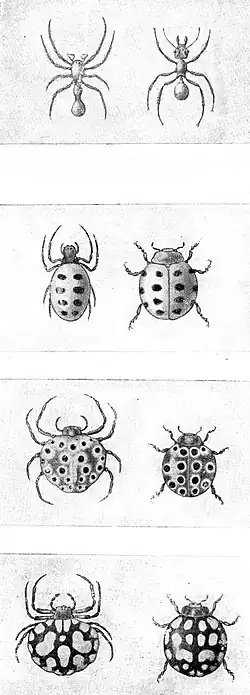 Joaninha (Coccinellidae) e besouros (Chrysomelidae) são considerados impalatáveis, e apresentam cores de destaque denominadas apozemáticas, geralmente, com manchas contrastantes. Um grupo inteiro de baratas filipinas do gênero Prosoplecta mimetiza esses besouros, tendo sofrido modificações profundas para alcançar a semelhança. Para simular a forma curta e arredondada das joaninhas, as grandes asas traseiras das baratas são enroladas e dobradas em uma forma sem paralelo em outros insetos. Outro grupo que comumente imita joaninhas são as aranhas que imitam as cores e manchas na parte superior.