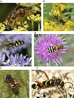 A ordem Hymenoptera (especialmente as abelhas, vespas e marimbondos), normalmente é bem protegida contra a maioria dos predadores, possuindo além de uma coloração de advertência, picadas dolorosas. Sendo assim são imitados por insetos de muitas outras ordens.