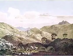 Pintura retratando a lavra do ouro em primeiro plano e Vila Rica ao fundo (Rugendas, 1820-1825).