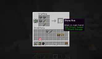 Os jogadores podem criar uma grande variedade de itens em Minecraft para atenderem as suas necessidades de sobrevivência.[45] Os itens fabricáveis incluem armaduras, que mitigam os danos dos ataques; armas (como espadas), que permitem que monstros e animais sejam mortos com mais facilidade; e ferramentas, que quebram certos tipos de blocos mais rapidamente. Alguns itens têm várias camadas, dependendo do material usado para fabricá-los, com itens de camada superior sendo mais eficazes e duráveis. Os jogadores podem construir fornos, que podem cozinhar alimentos, processar minérios e converter materiais em outros materiais.[46] Os jogadores também podem trocar mercadorias com aldeões através de um sistema de troca, que envolve a troca de esmeraldas por diferentes mercadorias e vice-versa.[47][34]
