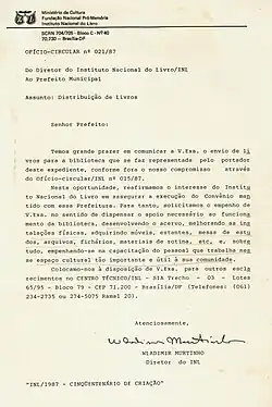 Cartilha de informações básicas do Programa Uma biblioteca em cada município, de responsabilidade do Sistema Nacional de Bibliotecas Públicas.