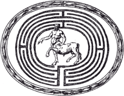 - ↑ Os padrões usados nos labirintos que podem ser vistos nas ilustrações ou inscrições da época não trazem caminhos sem saída, como se vê no conceito moderno de labirinto; ao contrário, geralmente consistem de um único caminho que serpenteia até chegar ao centro onde, em apenas uma guinada, um caminho alternativo leva à saída.Ver Kern, Through the Labyrinth, Prestel, 2000, capítulo 1, e Doob, The Idea of the Labyrinth, Cornell University Press, 1990, capítulo 2.