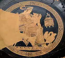 - ↑ A taça está ilustrada em Larissa Bonfante e Judith Swaddling, Etruscan Mythology (série The Legendary Past, Museu Britânico / Universidade do Texas) 2006, fig 29 p. 44 ("início do quarto século") ([https://web.archive.org/web/20011230074603/http://bama.ua.edu/~ksummers/cl222/LECT14/sld029.htm# Arquivado em 30 de dezembro de 2001, no Wayback Machine. ilustração online).