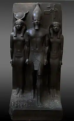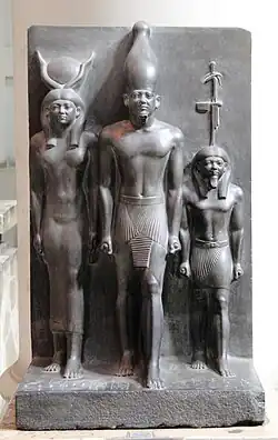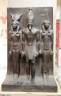 - Tríade de Hator, Miquerinos e Dióspolis – No centro fica Miquerinos que usa a Coroa Branca, usando também barba falsa e uma saia tripartida, caminhando com o pé esquerdo para a frente, Hator representa uma mulher coroada com chifres de vaca e disco solar que são típicos dela e uma deusa provincial usa um cocar que identifica a Dióspolis, Alto Egito.[8][9]