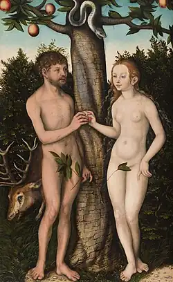 Para Lutero, no mito de Adão e Eva, cabe a Eva a culpa principal pela queda da humanidade, embora pense que Adão , o mais racional dos dois, o que melhor compreendera o tabu, deveria ter recusado a oferta da maçã. A punição de Eva foi devidamente mais severa, mas Deus teria deixado aberta a possibilidade de salvação para os dois sexos.[80]