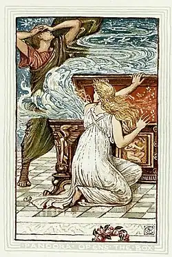 Na obra Misogyny: The World's Oldest Prejudice ("Misoginia: O preconceito mais antigo do mundo"), Jack Holland argumenta que há evidências de misoginia na mitologia do mundo antigo. Na mitologia grega, de acordo com Hesíodo, a raça humana já havia experimentado uma existência pacífica e autônoma como companheira dos deuses antes da criação das mulheres. Quando Prometeu decide roubar o segredo do fogo dos deuses, Zeus fica enfurecido e decide punir a humanidade com uma "coisa má para seu deleite". Esta "coisa má" é Pandora, a primeira mulher, que carregou um frasco (geralmente descrito - incorretamente - como uma caixa) que lhe foi dito para nunca abrir. Epimeteu (o irmão de Prometeu) é dominado por sua beleza, ignora as advertências de Prometeu sobre ela e se casa com ela. Pandora não pode resistir a espreitar o frasco e ao abri-lo ela desencadeia no mundo todo o mal; a humanidade fica condenada ao trabalho, à doença, à velhice e à morte em sofrimento.[41]