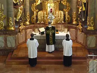 - ↑ Si altare sit ad orientem, versus populum, celebrans versa facie ad populum, non vertit humeros ad altare, cum dicturus est Dóminus vobiscum, Oráte, fratres, Ite, missa est, vel daturus benedictionem (Ritus servandus in celebratione Missae, V.3).