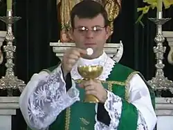 - O sacerdote distribuirá a comunhão para a congregação na missa, ele pega uma pequena hóstia, elevando-a em cima de um cibório, e diz em voz alta: «Ecce Agnus Dei, ecce qui tollit peccáta mundi» («Eis o Cordeiro de Deus, que tira o pecado do mundo»), e os demais repetem três vezes o «Dómine, non sum dignus». O padre dá a comunhão primeiramente aos demais clérigos presentes, em seguida aos acólitos e aos fiéis. Ao dar a hóstia na boca dos demais, faz com a mesma o sinal da cruz e diz: «Corpus Dómini nostri Jesu Christi custódiat ánimam tuam in vitam æternam. Amen.» («Que o Corpo de Nosso Senhor Jesus Cristo guarde a tua alma para a vida eterna. Amém»).[37]