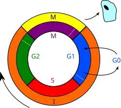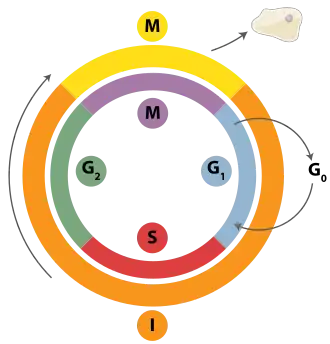 O ciclo celular compreende duas fases: a Intérfase e o Período de Divisão Celular ou Fase Mitótica, este segundo também designado por mitose.[3]