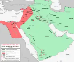 Em 669, a marinha de Moáuia invadiu até a Sicília. No ano seguinte, a fortificação em larga escala de Alexandria foi concluída.[168] Enquanto as histórias de Atabari e Albaladuri relatam que as forças de Moáuia capturaram Rodes em 672–674 e colonizaram a ilha por sete anos antes de se retirar durante o reinado de Iázide I, o historiador moderno Clifford Edmund Bosworth lança dúvidas sobre esses eventos e afirma que a ilha só foi invadida pelo tenente de Moáuia Junada ibne Abi Omaia Alazedi em 679 ou 680.[180] Sob o imperador Constantino IV (r. 668–685), os bizantinos iniciaram uma contraofensiva contra o califado, primeiro invadindo o Egito em 672 ou 673,[181] enquanto no inverno de 673, o almirante de Moáuia, Abedalá ibne Cais liderou grande frota que invadiu Esmirna e as costas da Cilícia e da Lícia.[182] Os bizantinos conseguiram grande vitória contra um exército árabe e uma frota liderada por Sufiane ibne Aufe, possivelmente em Silião, em 673 ou 674.[183] No ano seguinte, Abedalá ibne Cais e Fadala desembarcaram em Creta e em 675 ou 676, uma frota bizantina atacou Maracleia, matando o governador de Homs.[181]
