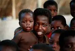 Os macuas são o grupo dominante na parte norte do país, os sena e shonas (principalmente ndaus) são proeminentes no vale do Zambeze e os tsongas são predominantes no sul de Moçambique. Outros grupos incluem os macondes, WaYaos, suaílis, tongas, chopes e ngunis (incluindo zulus). Povos bantos compreendem 97,8% da população, enquanto o restante, incluindo africanos brancos (em grande parte de ascendência portuguesa), euro-africanos (mestiços de povos bantos e portugueses) e indianos.[44] Cerca de 45 mil pessoas de ascendência indiana residem em Moçambique.[45]