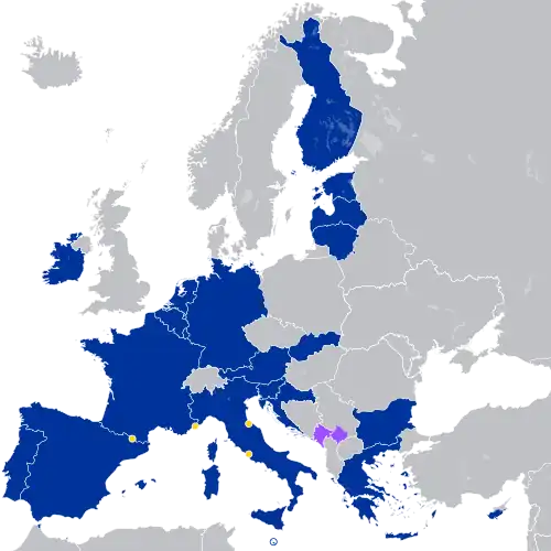 O Euro (EUR, €) é a moeda de 20 países da União Europeia (UE) - Alemanha, Áustria, Bélgica, Chipre, Croácia, Eslováquia, Eslovénia, Espanha, Estónia, Finlândia, França, Grécia, Irlanda, Itália, Letónia, Lituânia, Luxemburgo, Malta, Países Baixos e Portugal, e ainda de quatro micro-países europeus - Andorra, Mónaco, San Marino e Vaticano - e também do Montenegro e do Kosovo.