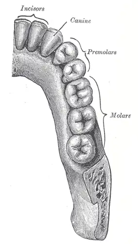 O molar é o mais complexo dos dentes na maioria dos mamíferos. Situa-se na parte posterior da mandíbula. A sua função primária é triturar alimentos, o que lhe vale o nome, que significa "mó" ou "pedra de moinho". Como são dentes que possuem várias pontas em sua área de contato com os alimentos, são ditos multicúspides.[1]