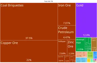 O país também é sustentado pela mineração: em 2017 o país produzia cerca de 20 toneladas de ouro e 160 toneladas de prata anuais; o país também minera cobre e estanho [26][27] e em 2019 era o 3º maior produtor do mundo de fluorita [28], o 4º maior produtor do mundo de tungstênio[29] e o 10º maior produtor do mundo de molibdênio.[30] O país também tem uma grande produção de carvão, tendo sido o 14º maior produtor mundial em 2018, com 49,5 milhões de toneladas extraídas, e o 7º maior exportador mundial (39 milhões de toneladas). [31]