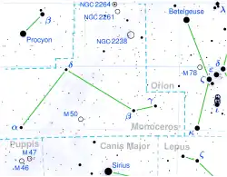 As constelações vizinhas são Gêmeos, Órion, Lebre, Cão Maior, Popa, Hidra e Cão Menor.[1]